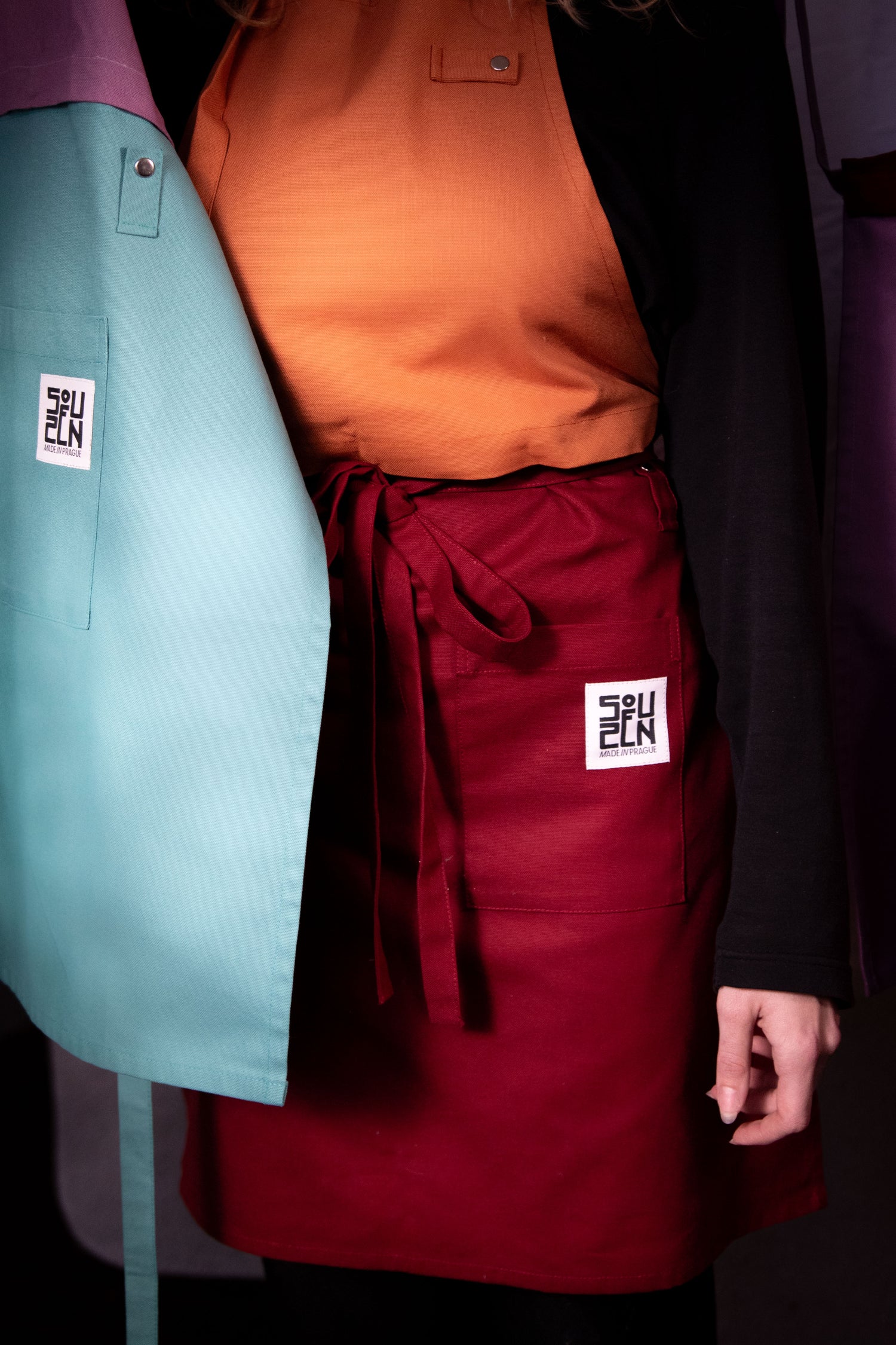 Její variabilita spočívá v možnosti rozepnout skrz patentky spodní a vrchní díl. Můžete tak nosit zástěru, která vás chrání od krku dolů, nebo po odepnutí vrchní části od pasu dolů. Každá zástěra má svou vlastní utěrku. Tu můžete úplně odepnout, připevnit na levý nebo pravý bok, abyste ji měli při vaření a tvoření po ruce, nebo ji lze připevnit na obou bocích, a mít tak dvojitou vrstvu od pasu dolů. Má kapsičku tak akorát na telefon nebo malý bloček. Na prsu pak máte možnost si připevnit ochutnávací lžičku, pinzetu a jiné drobné pomůcky.